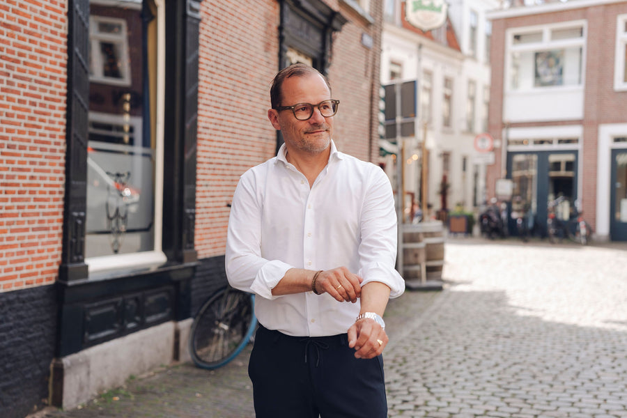 Wit overhemd met donkere knopen en bruine band in kraag van Michaelis in een fluweelzachte weving, luchtig en ademend. Geschikt voor zowel zakelijk als casual gebruik. Bevat donkere knopen. Het overhemd heeft een getailleerde pasvorm en bestaat voor 100% uit...